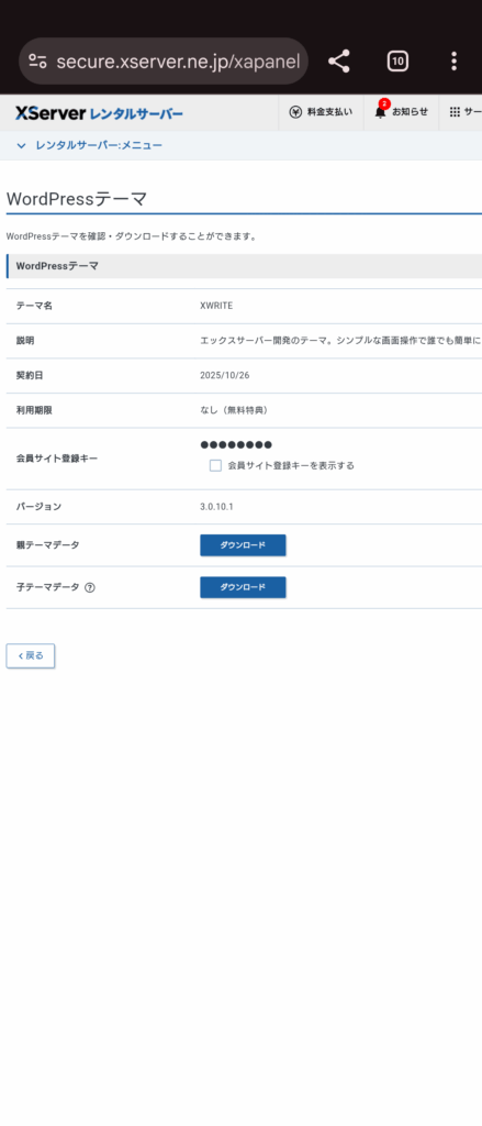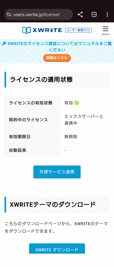 「ライセンス認証」の前に、「外部認証サービス連携」を行うためにXServerの個人ページから会員サイト登録キーをコピーします。
