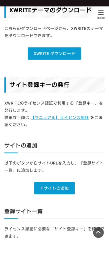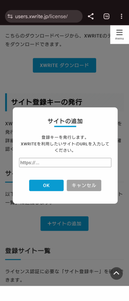 ライセンスページにアクセスし、「サイト登録キーの発行」の項目にある「サイトの追加」をクリックします。